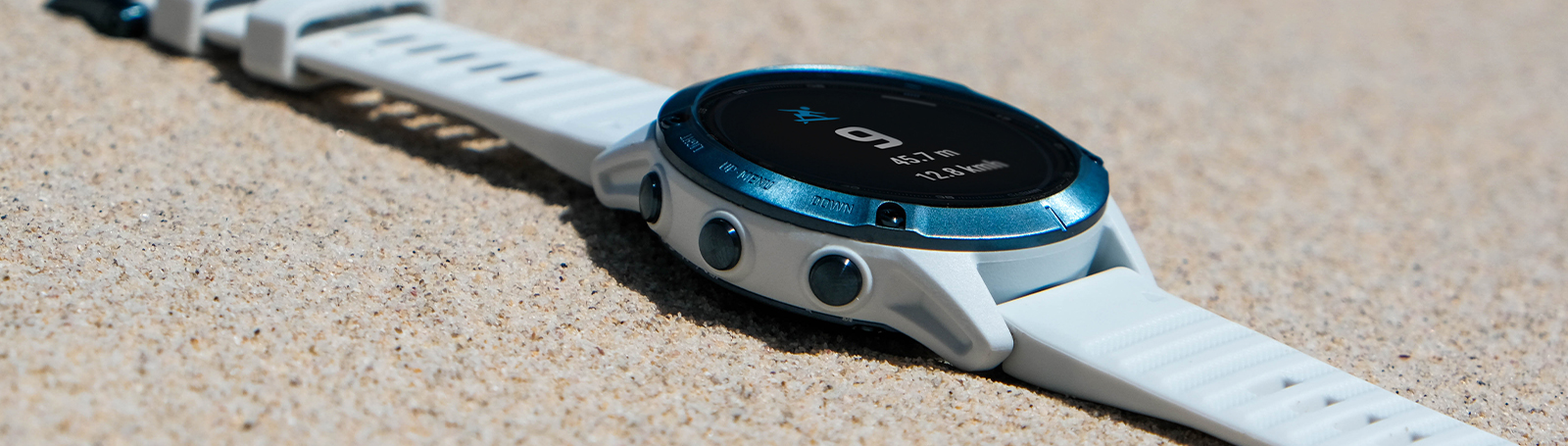 Inicio Relojes inteligentes Fēnix fēnix® 6: edición Pro Solar Azul mineral con correa blanca