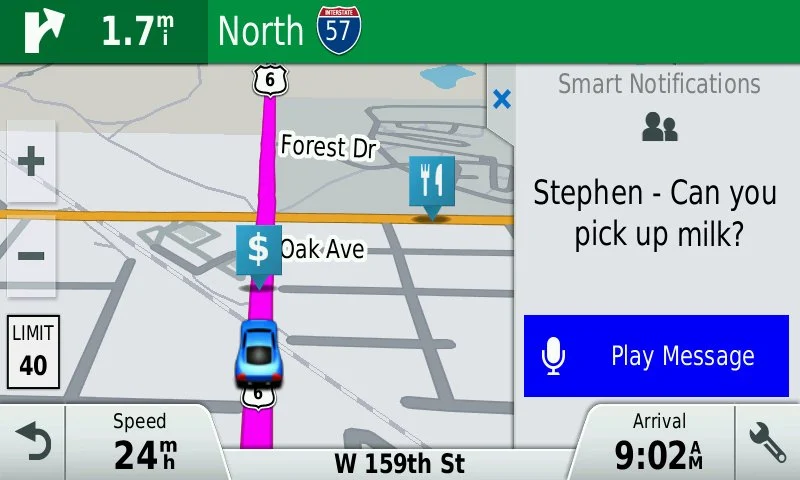 Al vincular este navegador con tu reloj Garmin compatible (se vende por separado), podrás recibir instrucciones de navegación directamente en la muñeca, incluso después de haber aparcado el vehículo y dirigirte a tu destino. Obtén también prácticas alertas de conducción en el reloj. No te preocupes si le pierdes la pista a tu vehículo en un aparcamiento abarrotado; la brújula del reloj inteligente te orientará desde donde hayas aparcado el vehículo hasta tu destino, y luego de vuelta.