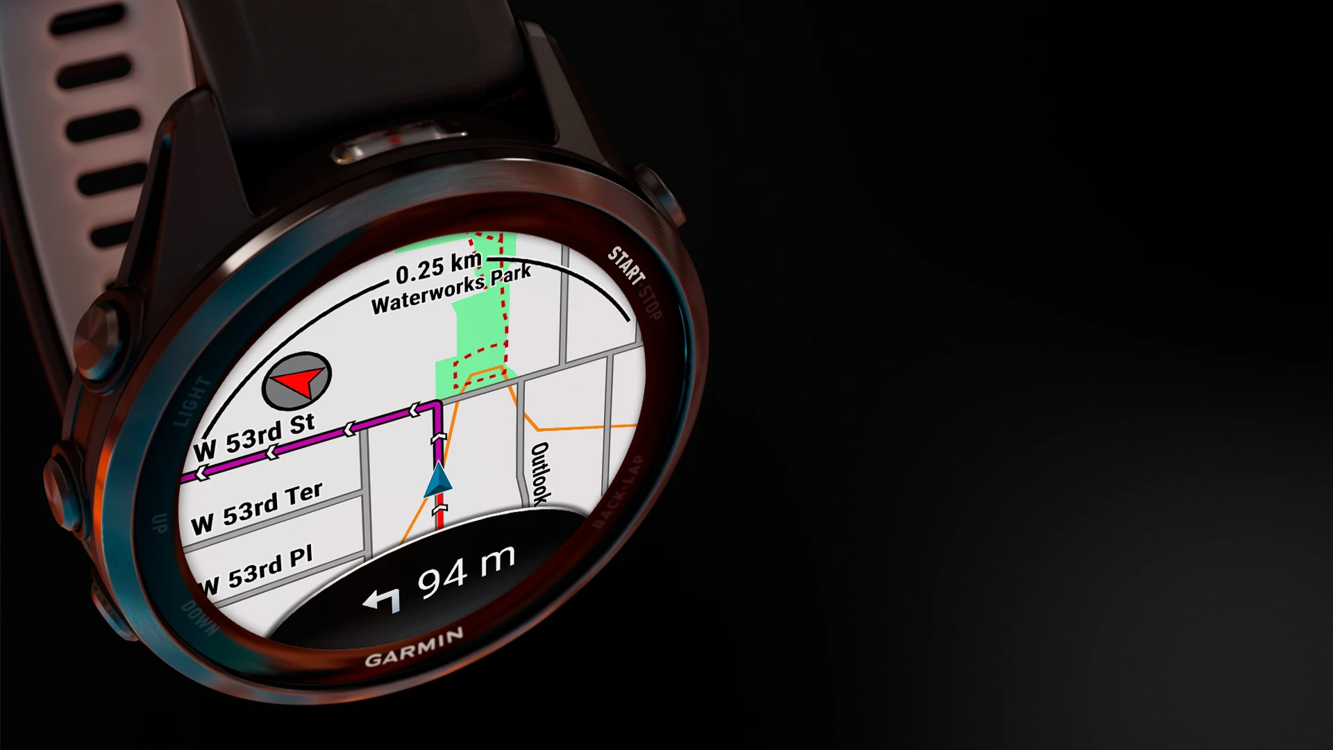 Tanto si sales a correr por las calles de la ciudad como si lo haces por pistas muy arboladas, el smartwatch Forerunner 970 proporciona mapas integrados a todo color, que ahora son incluso más dinámicos, intuitivos y fáciles de seguir.