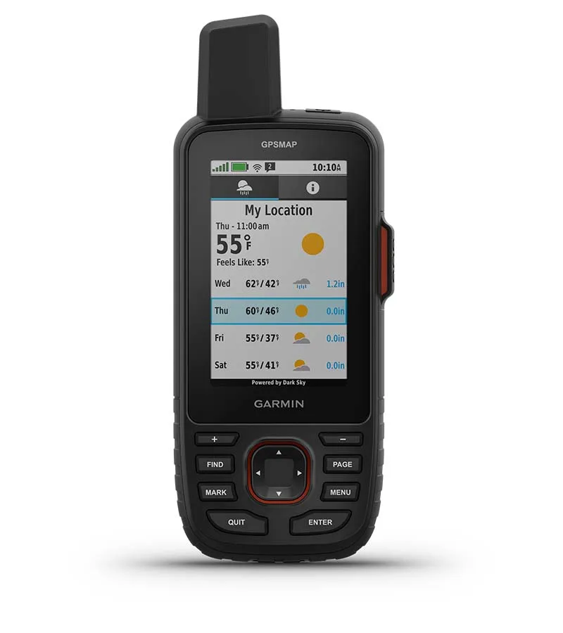 Utiliza la conectividad inReach para obtener actualizaciones detalladas del tiempo en el dispositivo de mano GPSMAP 67i. Solicita previsiones meteorológicas para tu ubicación actual, los waypoints o los destinos de la ruta.