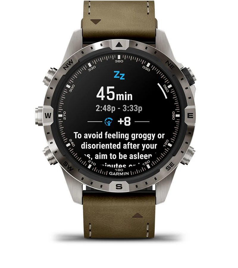 Ayuda a minimizar los esfuerzos del jet lag con información sobre la exposición a la luz, el horario de sueño y el ejercicio para tu próximo viaje de larga distancia. Introduce los datos del viaje en el calendario de la aplicación para smartphones Garmin Connect™ y haz un seguimiento de cómo tu reloj interno se adapta al nuevo destino.