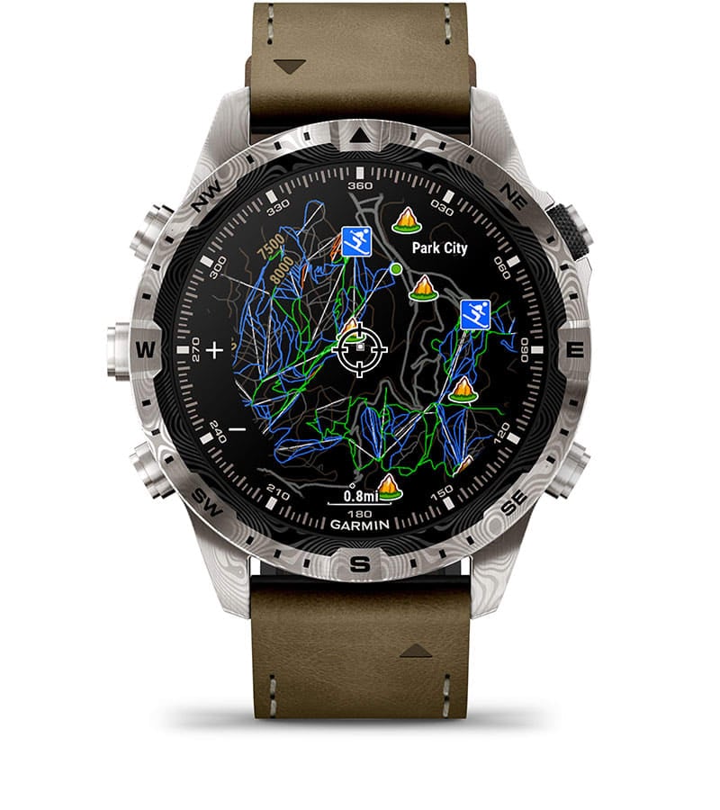 Disfruta de las actividades al aire libre con los mapas topográficos preinstalados y consulta los nombres de pistas y clasificaciones de dificultad de más de 2000 estaciones de esquí de todo el mundo.