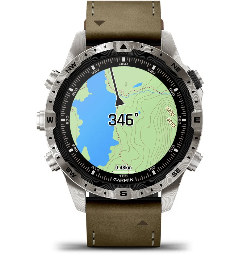 Utiliza el bisel con brújula grabado en 360 grados y la función de orientación para navegar con una brújula clásica superpuesta en el mapa.