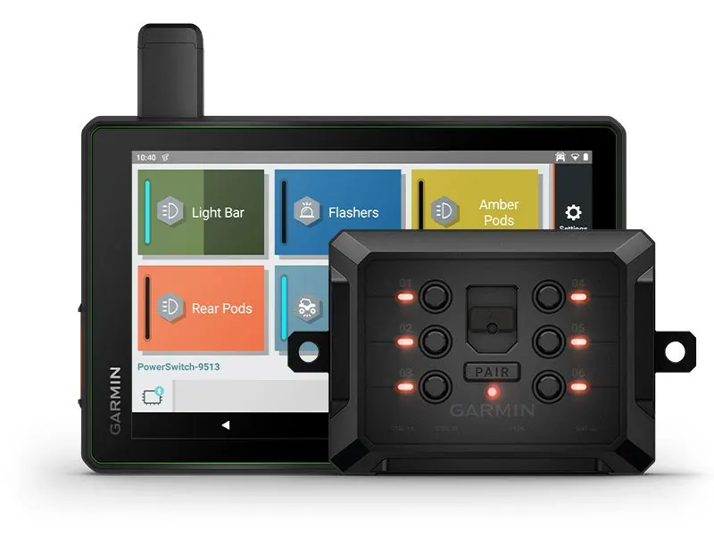 Vincula Tread con la caja de conmutadores digitales Garmin PowerSwitch™ compatible (se vende por separado) para permitir el control en pantalla de los componentes electrónicos de 12 voltios de tu vehículo: barras luminosas, bloqueos del diferencial y mucho más.