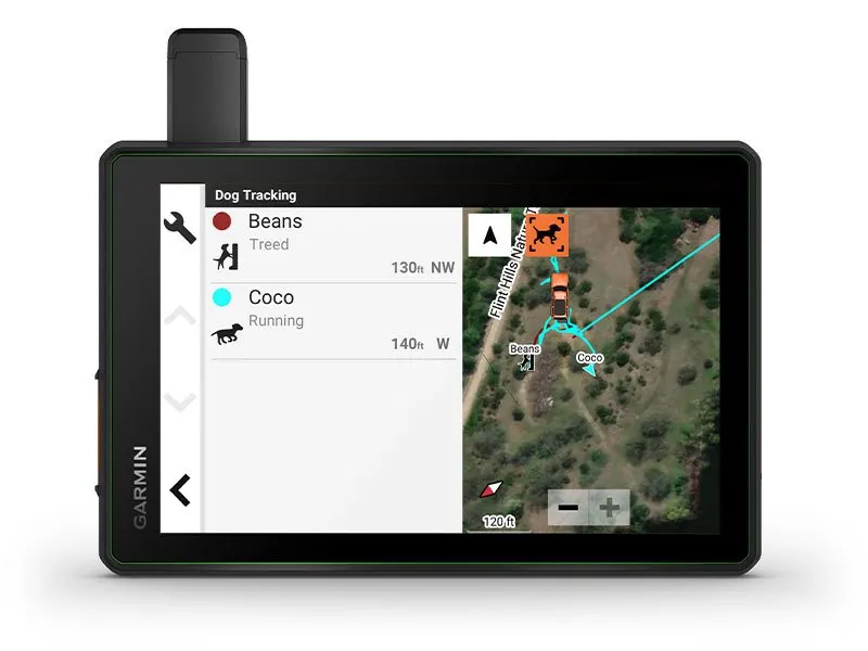Vincula de forma inalámbrica Tread con determinados trackers de perros Garmin GPS (se venden por separado) para ayudar a rastrear y recuperar a tus perros en el campo. Verás marcadores para cada perro dentro del alcance de seguimiento, superpuestos en la pantalla del mapa de el navegador por satélite.