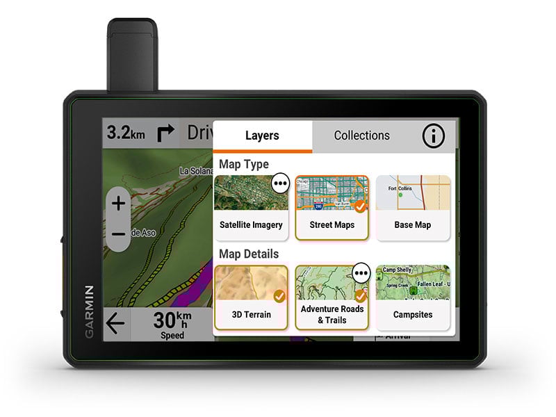 Tread incorpora mapas topográficos preinstalados con mapas de calles y terrenos en 3D de Europa, África, incluyendo Tracks4Africa, y Oriente Próximo. También incluye la opción de Garmin Adventurous Routing™ para poder recorrer las carreteras más montañosas y sinuosas y sin asfaltar. Norteamérica y Sudamérica, Australia y Nueva Zelanda están disponibles como descarga gratuita en garmin.com/express.