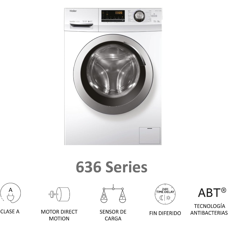 La lavadora Haier de carga frontal HW80-BP14636N tiene una capacidad de 8 kg y ofrece una velocidad de centrifugado de 1400 rpm. El dispositivo cuenta con un motor inverter, que proporciona un funcionamiento eficiente. Dispone de un panel de control que permite seleccionar diferentes programas de lavado, adaptándose a varios tipos de tejido. La máquina incluye un tambor diseñado para optimizar el movimiento de la ropa durante el lavado. Esta lavadora tiene una clasificación energética de tipo A, lo que indica su eficiencia en el consumo de energía. El agua utilizada en los ciclos puede variar según el programa seleccionado. La Haier HW80-BP14636N está diseñada para conectarse a un suministro de agua fría y es compatible con detergentes líquidos y en polvo. Además, cuenta con un sistema de seguridad que impide el funcionamiento si la puerta no está correctamente cerrada. El dispositivo también cuenta con un temporizador que permite programar el inicio del lavado en un horario específico. La lavadora se puede colocar en espacios donde haya acceso a una toma de agua y a un desagüe adecuado. Este modelo incluye un sistema de balanceo automático que ajusta la carga para minimizar el ruido durante el funcionamiento.