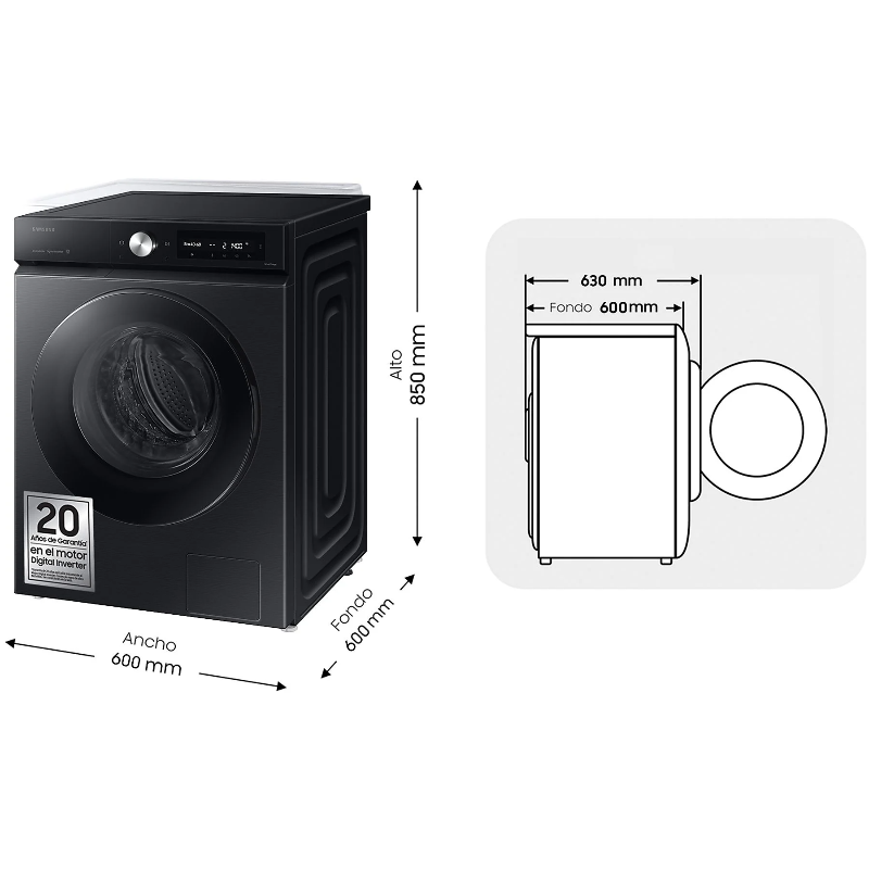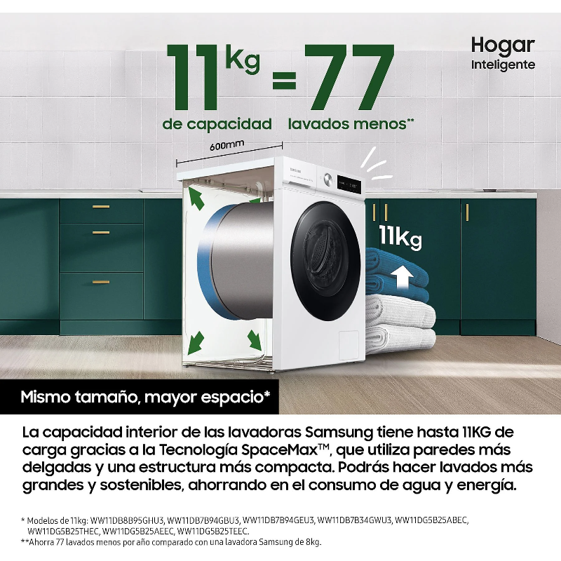 Samsung Lavadora de Carga Frontal 1400 rpm 11 kg WW11DB7B94G presenta una capacidad de carga de 11 kilogramos y una velocidad de centrifugado de 1400 revoluciones por minuto. Este modelo cuenta con un motor de inverter que permite un funcionamiento eficiente en términos de consumo energético. La lavadora incluye un tambor de acero inoxidable que facilita el lavado de una variedad de tejidos. Incorpora múltiples programas de lavado, diseñados para diferentes tipos de cargas y niveles de suciedad, y cuenta con una opción de carga retardada que permite programar el inicio del ciclo en un momento posterior. La tecnología de detección de carga ajusta automáticamente el consumo de agua según la cantidad de ropa. Además, incorpora un sistema de control de espuma para mejorar el rendimiento del lavado. El panel de control es electrónico y permite seleccionar funciones específicas de manera sencilla. La conectividad a aplicaciones móviles facilita el monitoreo y la gestión de los ciclos de lavado. Esta lavadora también cuenta con funciones de autolimpieza y un filtro que se puede extraer y limpiar. El diseño de la apertura frontal permite una carga y descarga cómoda de las prendas. Esta unidad es compatible con una amplia gama de detergentes y suavizantes.