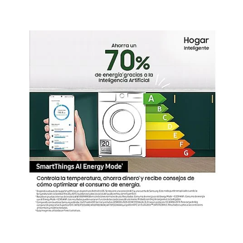 La lavadora Samsung de carga frontal modelo WW80CGC04DTHEC tiene una capacidad de 8 kg y una velocidad de centrifugado de 1400 rpm. Esta lavadora cuenta con un motor inverter y un sistema de calentamiento de agua, que permite ajustar la temperatura del lavado. Dispone de múltiples programas de lavado adaptados a diferentes tipos de tejidos. La tecnología de detección de carga ajusta automáticamente el consumo de agua y energía según la carga. El tambor está diseñado para tratar adecuadamente las telas, y el modelo incluye función de inicio diferido. La pantalla digital permite un manejo sencillo de las diferentes configuraciones. Es compatible con conexiones a agua fría y caliente y tiene una eficiencia energética clasificada en la categoría A. Los componentes de la lavadora están fabricados con materiales que cumplen con normativas de seguridad y eficiencia. Esta lavadora incluye un sistema de eliminación de olores y manchas. Su diseño cumple con las normativas del sector en cuanto a emisiones sonoras y consumo. Puede conectarse a sistemas de control remoto a través de aplicaciones específicas de Samsung. Dispone de un sistema de autodiagnóstico para facilitar el mantenimiento y la detección de problemas. Este modelo es adecuado para usuarios que buscan una lavadora con características tecnológicas específicas y eficiencia en el lavado.