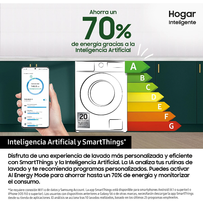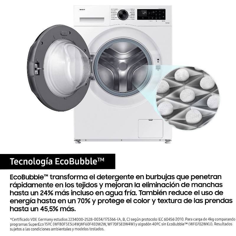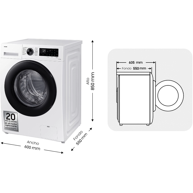 La Lavadora Samsung de Carga Frontal tiene una capacidad de 9 kg y una velocidad de centrifugado de 1400 rpm. Este modelo, identificado como WW90CGC04DAEEC, cuenta con un motor Digital Inverter que utiliza imanes en lugar de escobillas, lo que puede contribuir a una menor fricción y una reducción en el ruido durante el funcionamiento. La lavadora está equipada con un tambor de diseño especial que facilita la limpieza y el lavado de diferentes tipos de tejidos. La máquina incluye varias funciones y programas de lavado que se adaptan a diversas necesidades de cuidado de la ropa. También posee una tecnología de control del agua que puede ajustar automáticamente la cantidad de agua necesaria según el peso de la carga. Dispone de una opción de lavado rápido que puede ser útil para cargas ligeras. Además, su interfaz permite seleccionar diferentes ciclos y ajustar las configuraciones según los requerimientos específicos. Este modelo es compatible con la tecnología Smart Check, que ofrece la posibilidad de detectar problemas en el funcionamiento a través de una aplicación móvil. La instalación del aparato se realiza de manera convencional, con conexión a la red eléctrica y a la fuente de agua. Este producto cumple con las normativas de eficiencia energética, clasificándose en una categoría que se verifica mediante pruebas estandarizadas. La Lavadora Samsung de Carga Frontal WW90CGC04DAEEC es un dispositivo diseñado para lavado de prendas, con características técnicas que se pueden consultar en el manual del usuario.