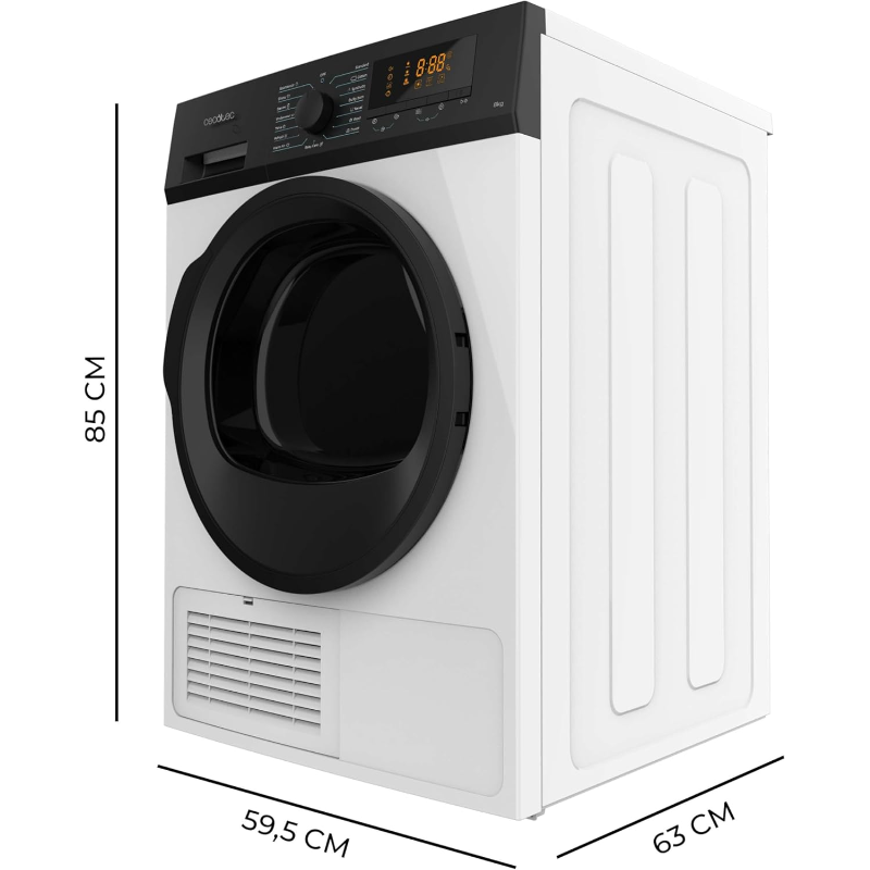 La Secadora 8 kg Cecotec Bolero DressCode Condensación 8200C cuenta con una capacidad de secado de 8 kilogramos, adecuada para cargas de ropa de tamaño promedio. Tiene un sistema de condensación que recoge la humedad del aire, permitiendo la instalación en espacios cerrados sin necesidad de una salida de aire exterior. La clase energética del dispositivo es B, lo que indica su eficiencia en el consumo de energía eléctrica en comparación con otros modelos. Esta secadora incluye múltiples programas de secado, que permiten adaptar el ciclo a diferentes tipos de tejidos y niveles de humedad. Su diseño incorpora un panel de control con botones para facilitar la selección de programas. Además, dispone de un tambor de acero inoxidable, lo que contribuye a la resistencia del componente. La Secadora 8200C funciona mediante una bomba de calor, lo que le permite operar a temperaturas más bajas durante el secado. Este modelo también cuenta con un filtro de pelusas accesible, que permite una limpieza sencilla y rápida para mantener el rendimiento del aparato. La máquina se alimenta a través de un enchufe estándar y está diseñada para uso exclusivo con electricidad. Es compatible con un ciclo de secado programado y cuenta con una función de inicio retrasado. El nivel de ruido durante el funcionamiento es de 67 dB. Dispone de un ciclo de secado adicional que se puede activar para prendas que requieren más tiempo de secado. Su mantenimiento consiste en la limpieza periódica de filtros y el vaciado del depósito de agua de condensación.