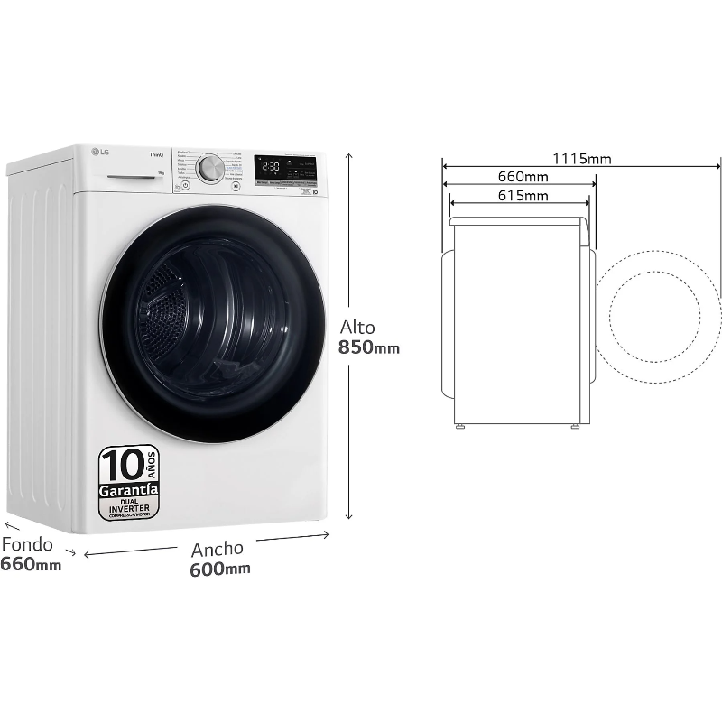 La Secadora LG RH90V9AV3N tiene una capacidad de 9 kg y pertenece a la clase energética A+++. Este modelo utiliza bomba de calor para el secado de la ropa. Incorpora un sistema de control digital que permite seleccionar diferentes programas de secado según el tipo de tejido. Entre sus características se encuentra la tecnología de secado por condensación, que recoge la humedad del aire y la drena a través de un sistema de desagüe. Su panel de control es intuitivo y facilita la selección de funciones como el secado suave o el secado rápido, adaptándose a diversas necesidades de colada. La secadora cuenta con múltiples sensores que detectan la humedad residual en la ropa, lo que permite ajustar automáticamente el tiempo de secado. Además, tiene un filtro de fácil acceso para la limpieza, asegurando un mantenimiento sencillo. Su diseño incluye una puerta reversible que proporciona flexibilidad en la instalación. La secadora es compatible con sistemas de instalación en espacios reducidos, facilitando su ubicación en diferentes entornos. Su funcionamiento se basa en un compresor que reduce el consumo energético, siendo este un factor relevante en su clasificación de eficiencia energética. La LG RH90V9AV3N puede conectar a un desagüe directo o utilizar un depósito de agua extraíble para el agua condensada.