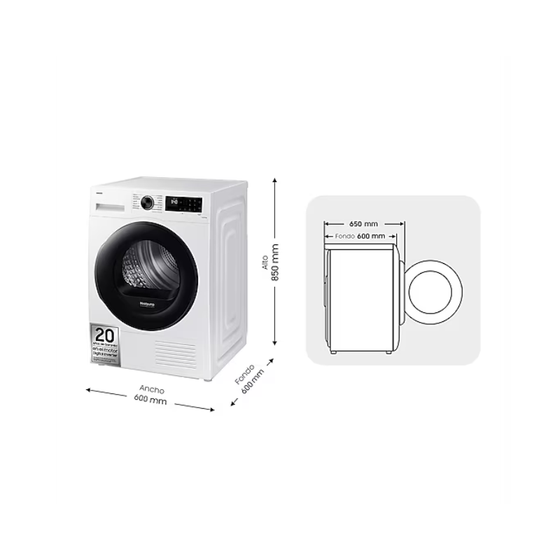La Secadora Samsung DV90CGC2A0AEEC cuenta con una capacidad de 9 kg y una clasificación energética A+++, lo que la posiciona en un rango eficiente en el consumo de energía. Este modelo utiliza tecnología de bomba de calor para el secado de la ropa, lo que implica un proceso de calentamiento que reutiliza el aire caliente, generando un menor impacto energético en comparación con los sistemas tradicionales. El equipo está diseñado con un tambor de acero inoxidable, favoreciendo la durabilidad y una distribución uniforme del calor durante el ciclo de secado. Entre sus funciones, se encuentra el programa de secado delicado que se ajusta a distintos tipos de tejidos, así como la opción de inicio en diferido, que permite programar el funcionamiento en horarios específicos. El panel de control es digital, facilitando la selección de ciclos y ajustes. El sistema de filtrado de condensación ayuda a mantener el rendimiento de la secadora, eliminando la humedad de manera eficaz. Este modelo está diseñado para conectarse a una toma de corriente estándar y cuenta con un consumo medio de energía que se encuentra dentro de los límites establecidos por las normativas de eficiencia energética. Las instrucciones de instalación y mantenimiento están incluidas, asegurando un uso adecuado a lo largo del tiempo. La Secadora Samsung DV90CGC2A0AEEC destaca por su capacidad de secado y características técnicas que permiten su integración en diferentes contextos de uso.